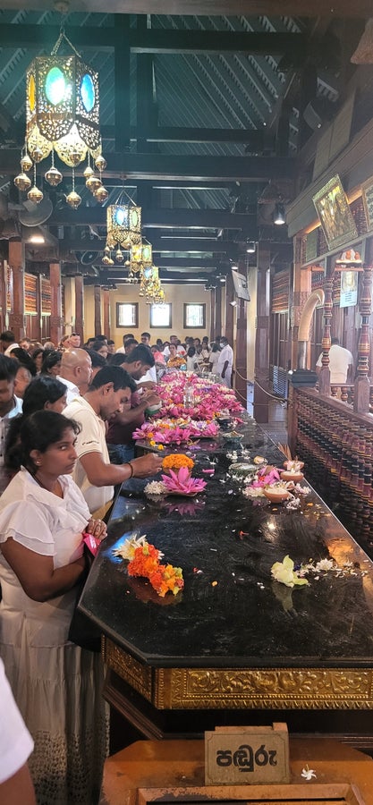 Ein renovierter Altbau mit Innenhof, der heute eine haushohe Lobby beherbergt…schöne Zimmer, sehr geschmackvoll und eine japanische Speisekarte.Ganz in der Nähe der sogenannte Zahntempel, eines der heiligsten Buddharelikte Sri Lankas: ein Zahn von Buddha ist hier verwahrt und wird einmal im Jahr mit den hauseigenen Elefanten durch die Stadt getragen.Der Tempel selbst eine Ansammlung von ineinander verschachtelten alten buddhistischen Gebäuden. Ich bin zur Vollmond Nacht hier….die Gläubigen kommen zu Hunderten, es ist eine Festivalstimmung….sie schieben sich mit Blumen in den Armen zu den Gebetsaltären, dekorieren die Blüten und versinken in andächtiger Meditation. Auch die Straßen der Stadt sind voll von weißgekleideten Menschen, die hier den freien Tag, der ist zur Vollmondzeit immer einmal im Monat, verbringen, sich mit Freunden treffen und beten.