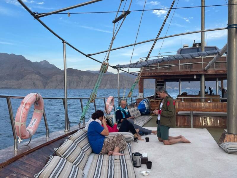 Unsere Crew kredenzt uns dreimal täglich ein wundervolles Essen mit allem, was das Herz begehrt. Wir halten keinen Ramadan ein – nur Alkohol – den gibt es selbstverständlich nicht. Die Gesellschaft meiner Mitreisenden ist ausgesprochen nett, die Unterhaltungen kurzweilig und interessant, die Ruhezeiten … chillen, lesen, dösen … genießen auf den Matratzen auf dem Vorderdeck. Der Koch schickt Leckereien herauf, Tee und omanischen Kaffee, mit Rosenwasser und Kardamom, werden gereicht…es geht uns gut, ausgesprochen gut.