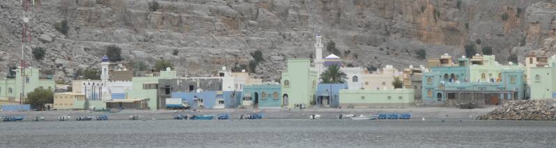 Die Dhau umrundete Mussandam, entlang der steinernen, zerklüfteten Küste. Kasabh ist die einzige Stadt, Fischerdörfer, wie z. B. Kumzar, finden sich an den Küsteneinschnitten. Sie drängen sich an die Felsen auf dem kleinen Stück flachen Landes, das sich hier gegen das Meer behauptet. Wir besuchten vier Dörfer, von ganz klein bis schon fast Kleinstadtgröße.